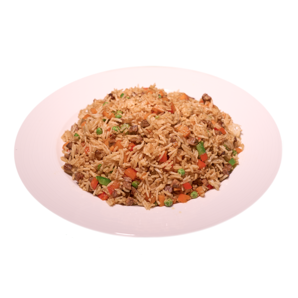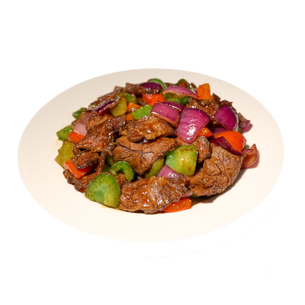 The chili beef stir-fry consists of beef stir-fried with red and green bell peppers, green onions, garlic, and ginger; the heat level is optional
